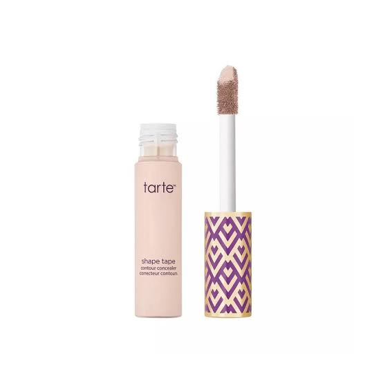 This is the Tarte Shape Tape Contour Concealer, a highly acclaimed and popular makeup product known for its full coverage and ability to conceal imperfections while providing a smooth, flawless finish. The packaging is distinctive, featuring a bold purple tube with a repeating geometric pattern in gold and a lighter lavender shade. The brand name "tarte" is prominently displayed at the top, followed by the product name "shape tape contour concealer" and its French translation, "correcteur contours." Â